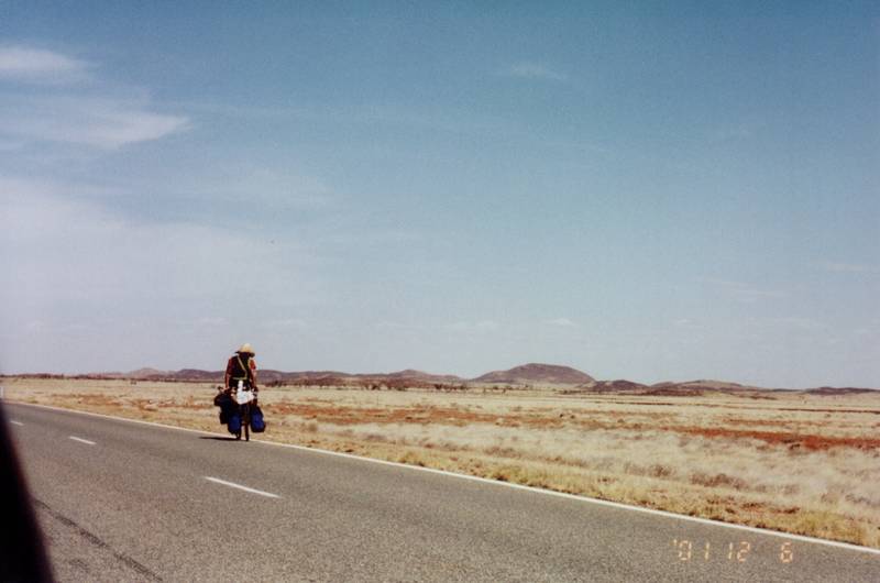 There is a hard-bitten breed of suicidal maniacs who get their kicks out of touring the entire continent of Australia by bicycle. Personally I cannot comprehend the mentality of someone who wants to punish themselves to that level of torture. It was bad enough labouring between road stations by car, trying to keep the ambient temperature in our vehicle below 50 degrees centigrade, let alone physically working up a sweat as well. Of course we also had the luxury of an ice box to keep our drinks cool, plus a barrier between us and the myriad of bush flies that plague the outback. The distance between road stations out in the desert is vast, several hundred miles is the norm with absolutely NOTHING in between, so these poor devils have to carry their entire world on their bike. This involves lugging a tent, clothes, cooking gear, food, plus at least their own weight in water. Just one look at all this encumbrance loaded up on two wheels made me feel exhausted and want to run for a beer. I cannot imagine what it must have felt like to have worked up a hell of a thirst after labouring for hours uphill, and the only thing available to slake it is hot water. On the way up North, we spotted one of these kamikaze pilots in the middle of nowhere trundling along at a snails pace into a headwind in the opposite direction. Quite aptly he was sporting a Japanese flag flapping wildly from an aerial affixed to his saddle. I just could not let this pass without taking a photo of this guy, for I didn't think anyone would believe me if I told them. We drew to a stop, and I jumped out of the car to quickly take a snap. Seeing me holding my camera, he slowed down from the breakneck 6mph he had spent hours accelerating up to, and drew up for a chat. Sure enough, he was a Japanese national, and I could not let the moment pass without dropping Kamikaze into the conversation. Ignoring my tactless insult he told us he had been on the road for months, and intended to ride right around the continent of Oz. The size of our average Asian cousins is never very impressive to start with, but this guy looked like he had less fat on him than a greasy chip. You would not believe he even had the strength to pull away on his heavily laden two wheeler, let alone haul himself the umpteen thousand miles he was facing in front of him. He'd already travelled well in excess of two thousand miles just to get where he was now. I could not help but admire the guy, even though I had to doubt his sanity in his quest. Waving goodbye we drove off into the distance, leaving him with the difficult task of getting enough momentum to maintain balance whilst accelerating back up to his optimum cruising speed. Three weeks later, we were on our return journey back down to Perth when we came across the same guy pulled over in a rest area. He was now several hundred miles further south, and looked to me like he weighed even less. Trotting over to him with my video camera I introduced myself as the tourist who had chatted to him weeks earlier. I invited him to come over to join us for a drink. He remembered us immediately and gleefully accepted our offer of a nice cold glass of something straight from the ice box. To my surprise however he turned down a beer, although thinking about it I suppose it made sense. In that sort of temperature any alcohol is likely to send you crackers in a very short period of time, plus the dehydration effect could give cause for concern as well. He was already carrying so much water with him it's a wonder the bike didn't fold under the weight. H2O is something you take for granted in the UK, and it takes a bit of a mind shift to appreciate how the lack of it's free availability out in the bush could evolve into a life threatening situation within hours. One of the key things people impressed upon anyone travelling in the outback is, what ever happens 'DON'T LEAVE YOUR VEHICLE' Many people have expired after doing just that. Any form of shade is almost non existent and wandering off only makes a bad situation ten times worse. (Not sure how that would work with a bike though) After a very pleasant chat lasting more than 30 minutes we once more set off on our journey South, leaving our Japanese friend with a flask full of ice cold water. I often remember our chance encounter, and it wears me out just to think that he must still be on the road now. If anyone sees him, please give the lunatic my regards...